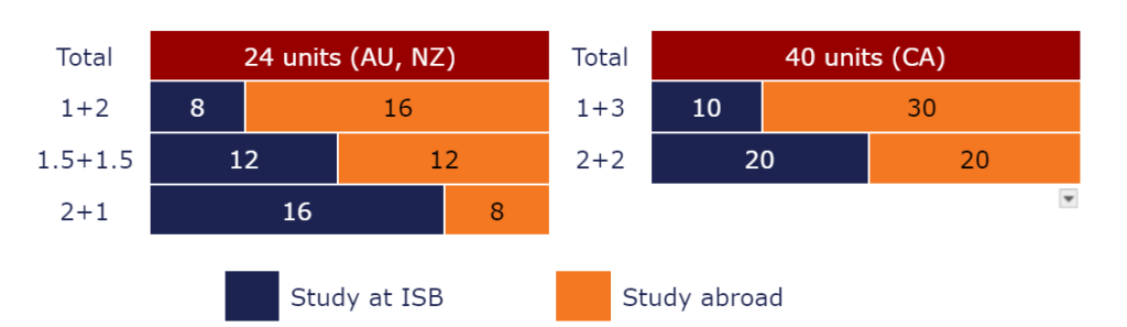A Bachelor’s degree usually requires about 24 units over 3 years in Australia and New Zealand, and around 40 units over 4 years in Canada. The transfer model you choose determines the division of units between studying at ISB and studying abroad, with options varying by university, degree, and major.